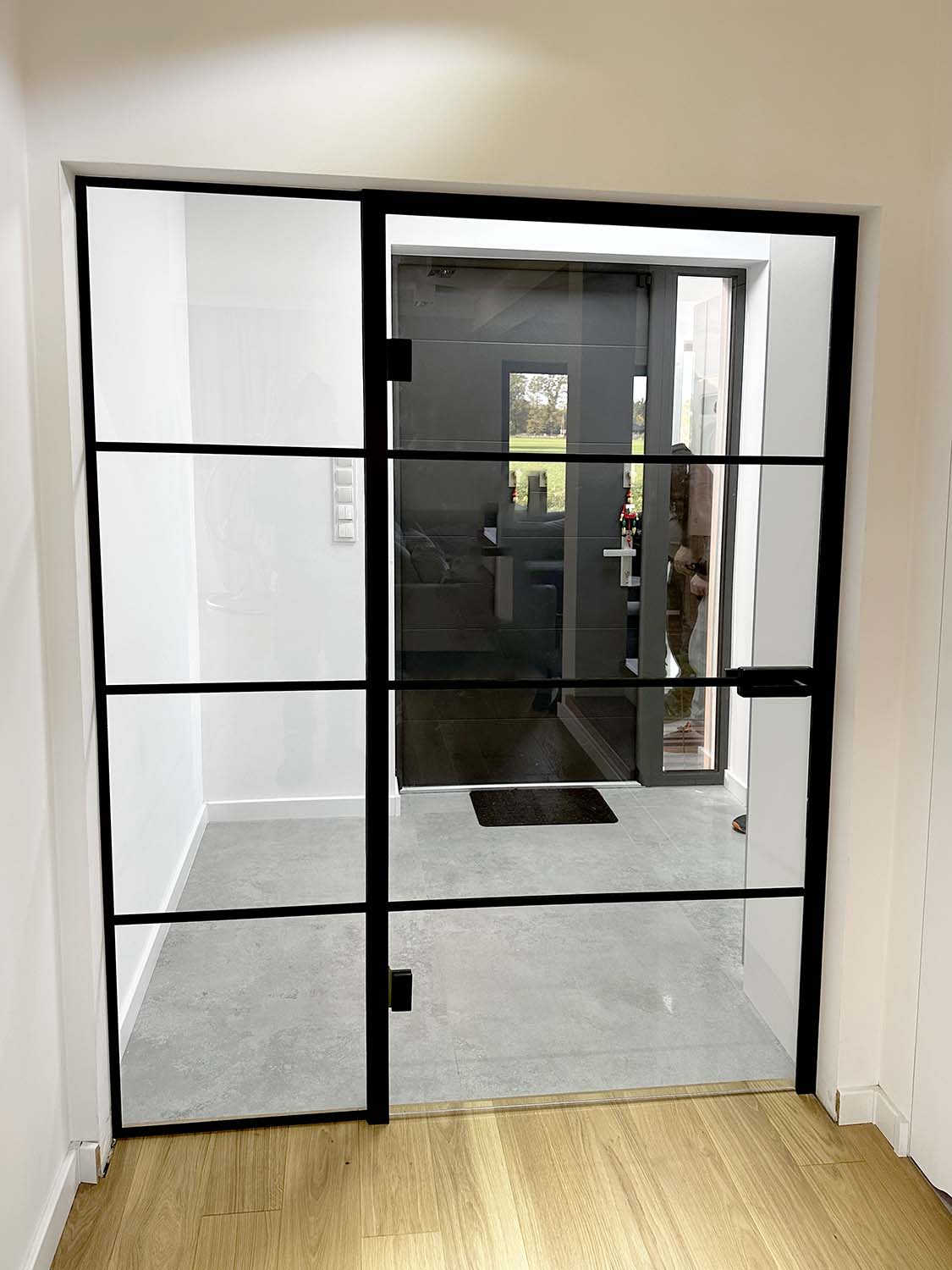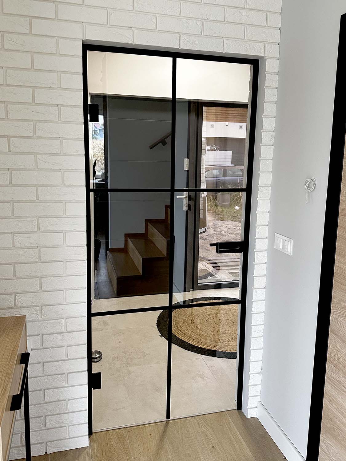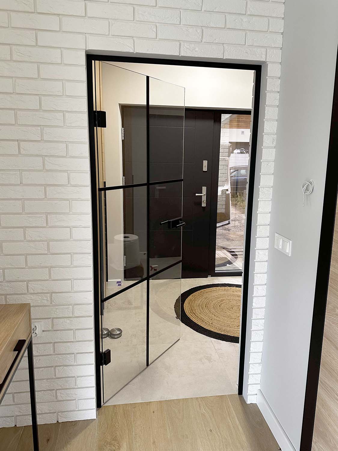 Drzwi z czarną ościeżnicą, szprosowane po obu stronach.