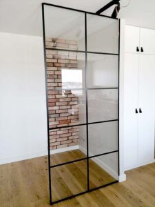 Zabudowa złożona z drzwi szklanych oraz ścianki stałej.