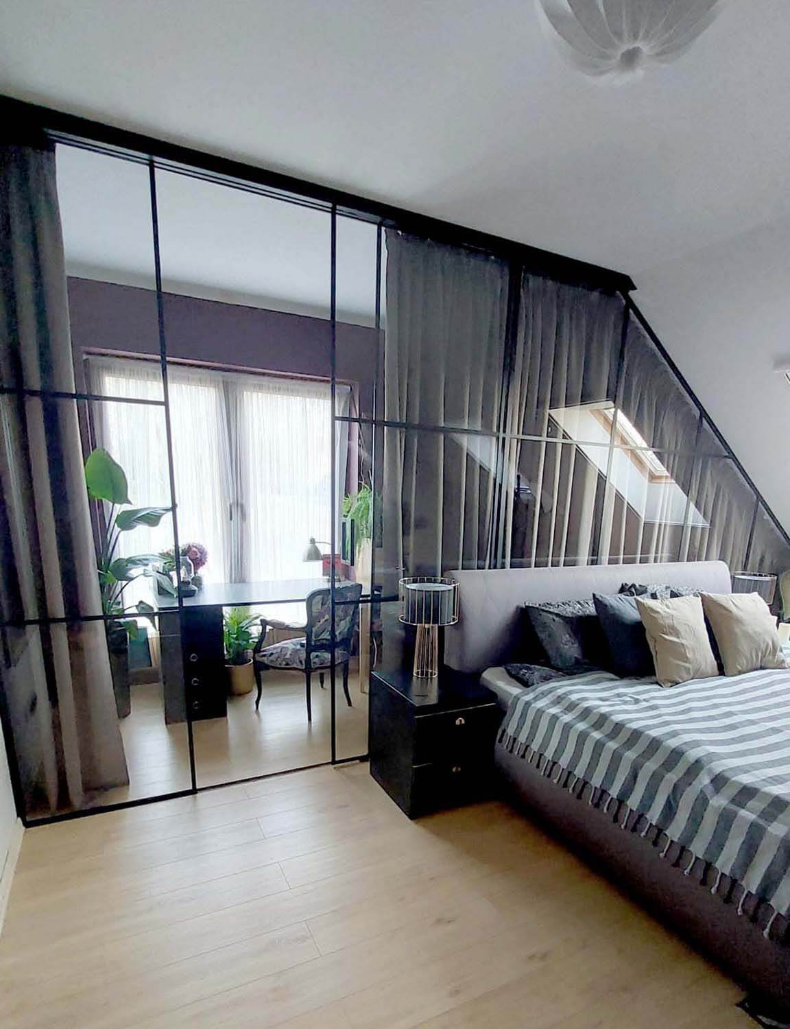 Dzięki dużym oknom lub przeszkolonym ścianom, sypialnia staje się jasna i przestronna, co może wpływać pozytywnie na samopoczucie mieszkańców.